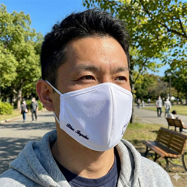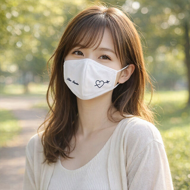 こちらは、ブルーインパルスの展示飛行で見られるハート雲柄を縫い込んだマスク(ホワイト)です。